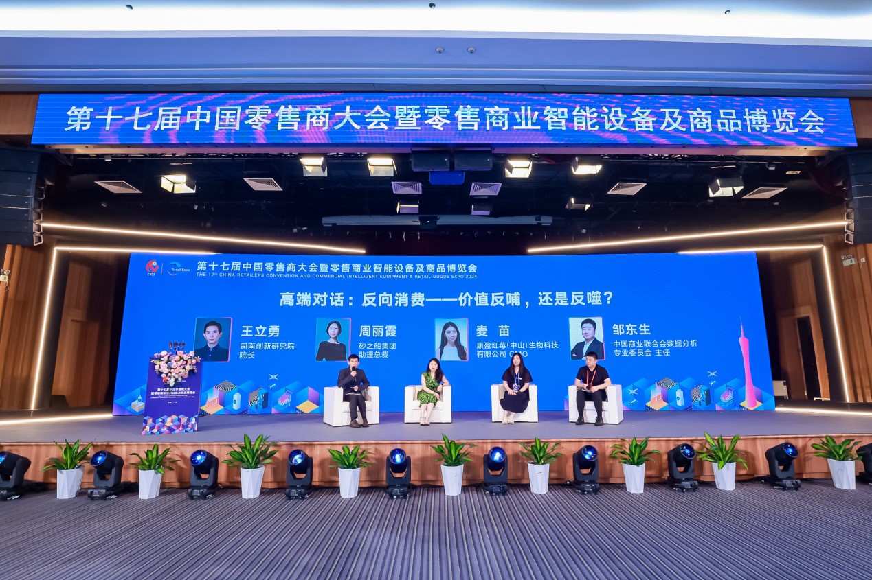 在高端對話環(huán)節(jié),司南創(chuàng)新研究院院長王立勇、砂之船集團助理總裁兼分公司總經(jīng)理周麗霞、康盈紅莓(中山)生物科技有限公司CMO麥苗、中國商業(yè)聯(lián)合會數(shù)據(jù)分析專業(yè)委員會主任鄒東生就“反向消費-價值反哺,還是反噬?”這一話題進行了深入討論,為與會者提供了獨特的視角和思考。